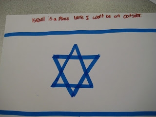 Continuing on with the commands, I asked the students to watch and listen to me, as I put a white piece of paper on the board, and took a blue marker, then drew a line across the top of the paper with the marker. I issued commands to myself, until I had drawn the Israeli flag on my piece of paper. The students then did the same as they followed my commands. Once we had all made the flag, I continued the discussion activity.